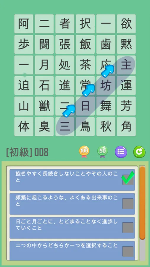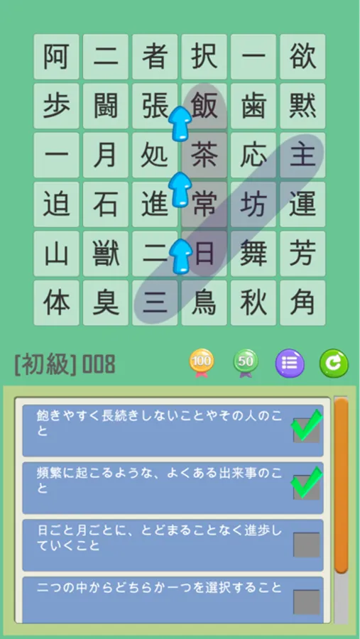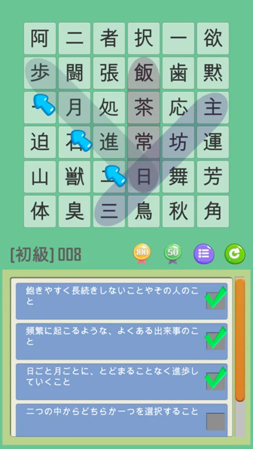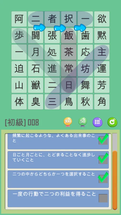 四字熟語は、→(左から右)、←(右から左)、↓(上から下)、↑(下から上)、↘(左上から右下)、↗(左下から右上)、↙(右上から左下)、↖(右下から左上)の8方向に並んでいます。また、ゲームクリア数が増えるに連れて盤面数が多くなり、四字熟語も難しくなっていきます。