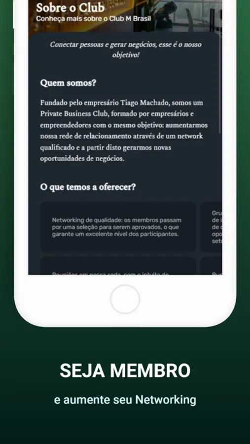 Aplicativo oficial do Club M Brasil, um Private Business Club, fundado pelo empresário Tiago Machado, com o objetivo de reunir empresários e empreendedores com o mesmo objetivo.