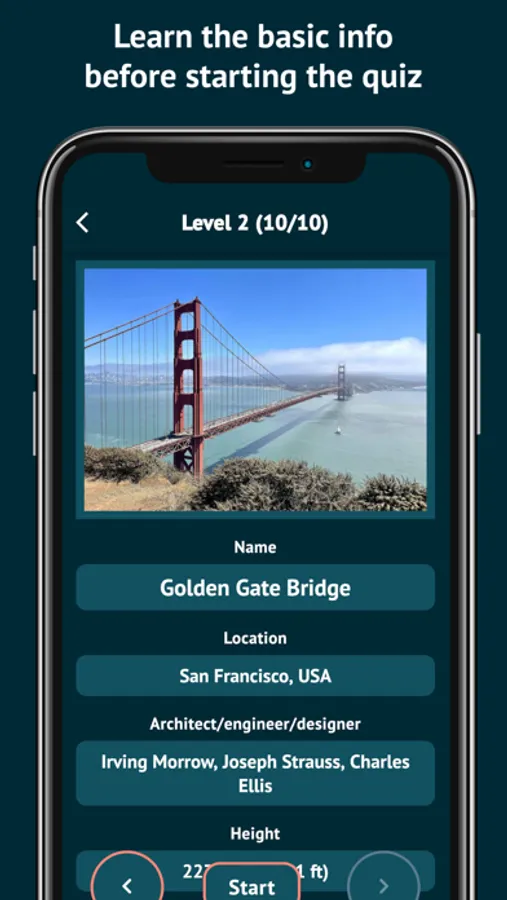 After clicking a level, you’ll see the learning screen, where you can see the landmarks and read about their name, location, architect/engineer/designer, year built/created, architectural style and height. Each level presents 10 landmarks and you can click the left and right round button at the bottom to go through them.