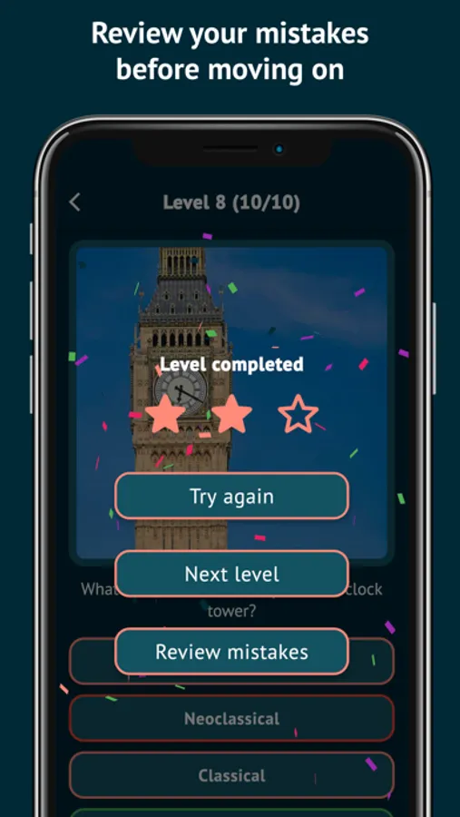 Once you feel you are familiar with the landmarks, click the start button to start the quiz game. Each level has 10 questions and depending on how many correct answers you get, you’ll get 3, 2, 1 or 0 star(s) after finishing a level. At the end of each level, you can choose to review your mistakes.