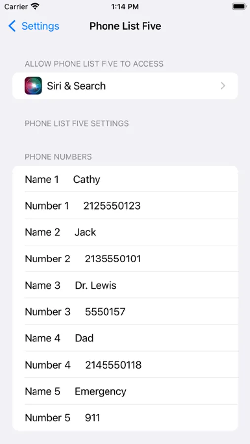 Go into the Settings app and look for Phone List Five. There are ten fields that you can use to enter up to five name/number pairs.