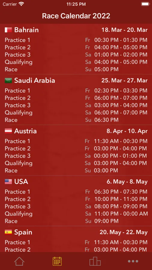 "Race Calendar 2022" is a simple to use App, which gives quick overview of all Formula 1 events and results. You can see at a glance the complete race calendar with detailed timetable (local) for each weekend, training and qualifying results, driver and team standings after each race and a lot of other information.