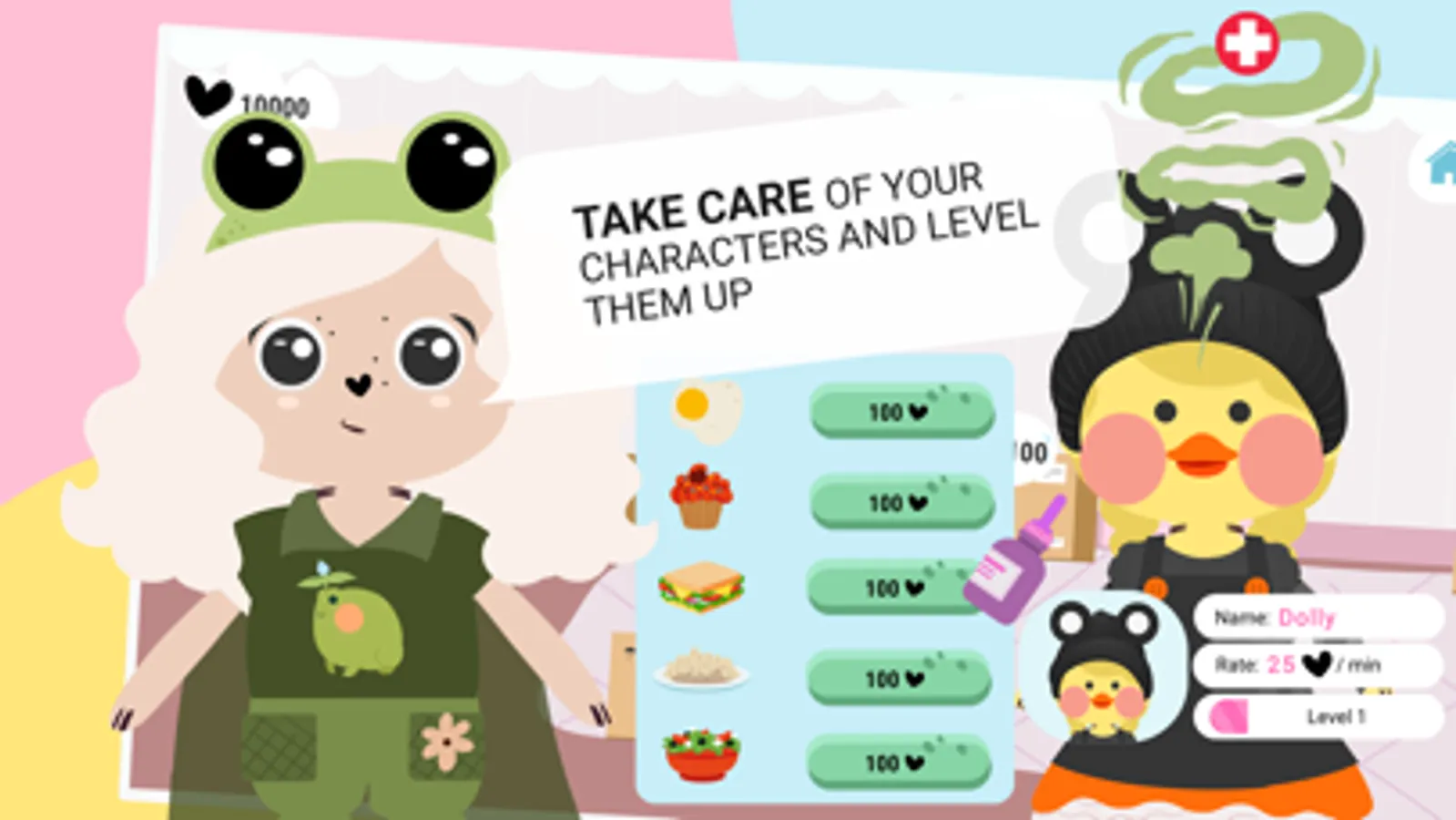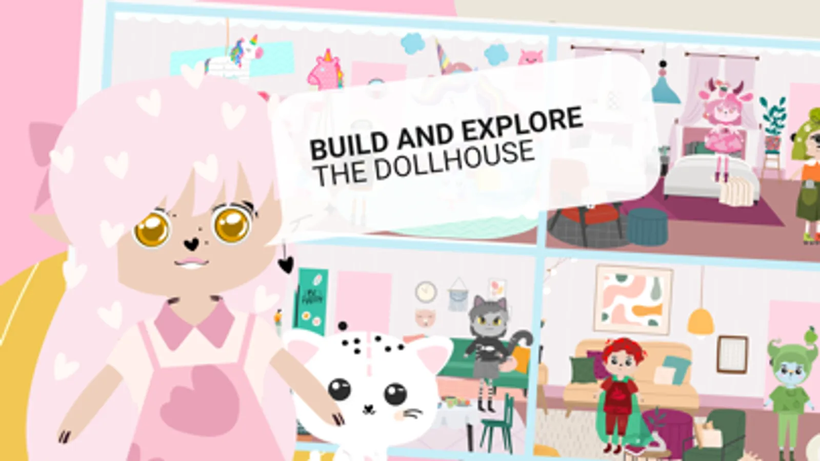 Build and explore the dollhouse. Find secret rooms and get rewards. There are some rooms with mini-games. Take care of your characters and level them up. Feed them and earn more hearts!