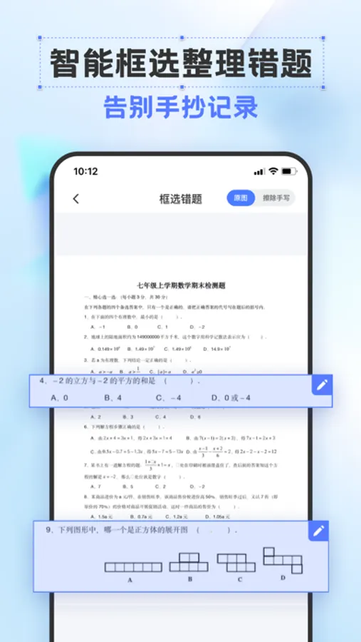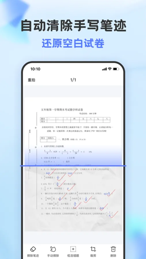 支持拍照扫描试卷还原,错题一键录入,自动清除手写字迹,还原空白试卷,是学习的好帮手!