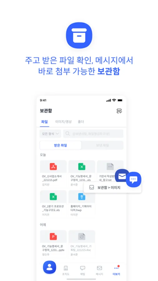 주고 받은 파일을 한 눈에 파악하는 것은 기본, 메시지에서 바로 파일을 첨부할 수 있는 보관함 기능을 경험하세요.