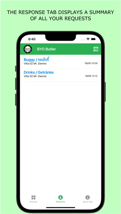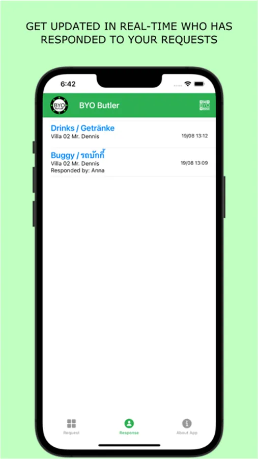 See all your requests on a single screen, together with the name of the responder. Be assured that your emergencies, as well as non-critical requests, are being attended to by your holiday resort, villa, restaurant and healthcare provider.