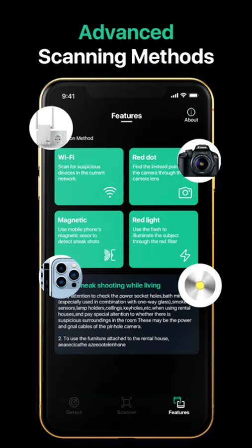 - Scan any room for hidden spy cameras and make sure no one is spying on you