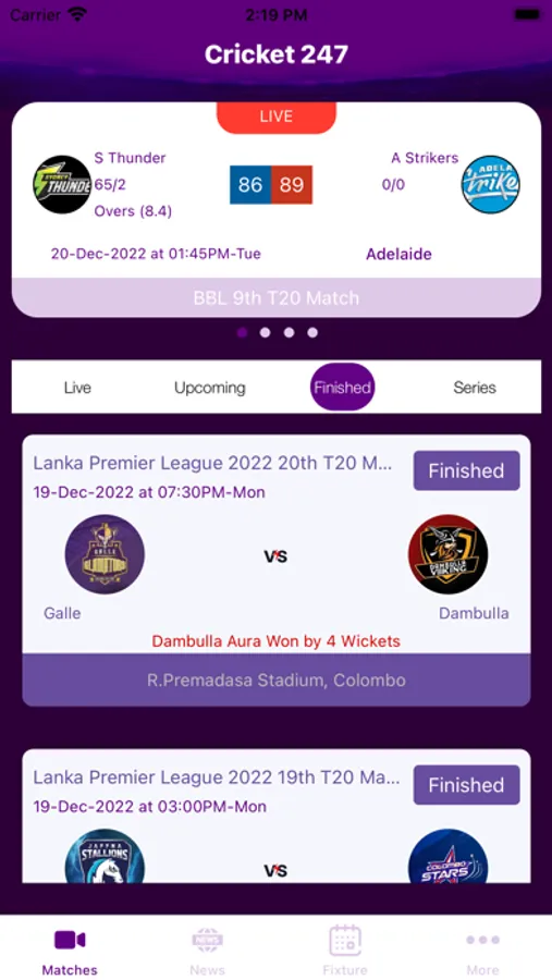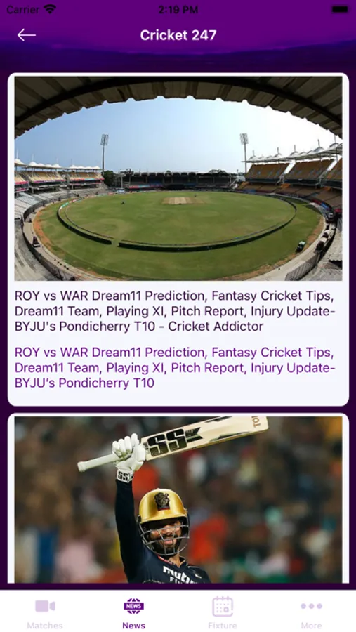 Cricket 247 gives you BETFAIR & BET365 & ball by ball fastest live Score updates of Live cricket matches for IPL, ICC, ODI, Test Matches, Twenty Twenty, etc which are faster than any other media or app, and gives you Forward Lambi, Session, Pitch Report, Weather Report LIVE TV, Multiple matches, and Other Information.