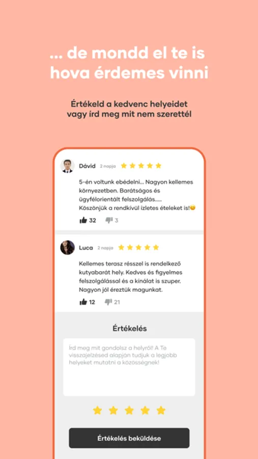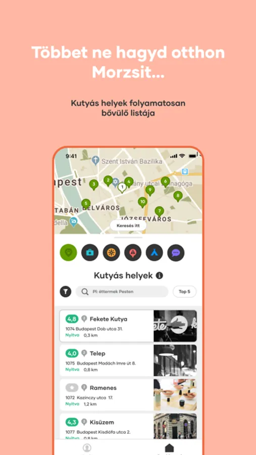 * Többé nem kell otthon hagynod kedvencedet: a kutyabarát helyek folyamatosan frissülő listájával mutatjuk, hova érdemes menni. A felhasználói értékelések segítségével a közösség megismerheti az igényeinek legmegfelelőbb fővárosi kutyás helyeket az éttermektől a mozikon át a strandokig.