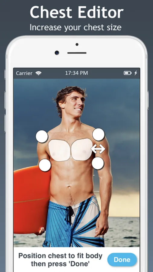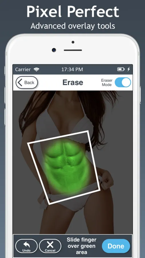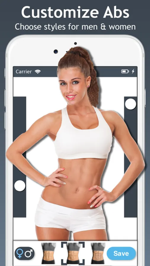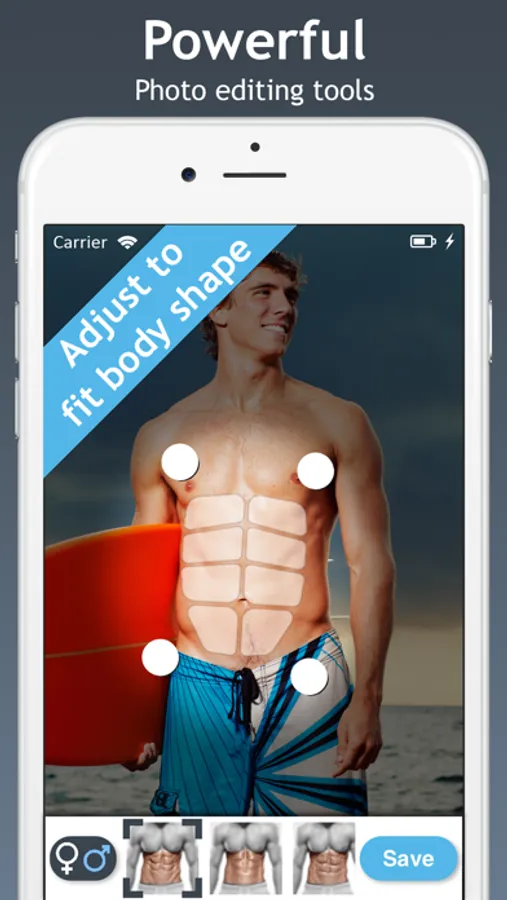 Use this simple and powerful photo editor to enhance your photos. Choose from a pre-defined set of perfect abs to overlay onto your body. Then use the tools provided to blend the colour and fit to get that pixel perfect finish on your photos.