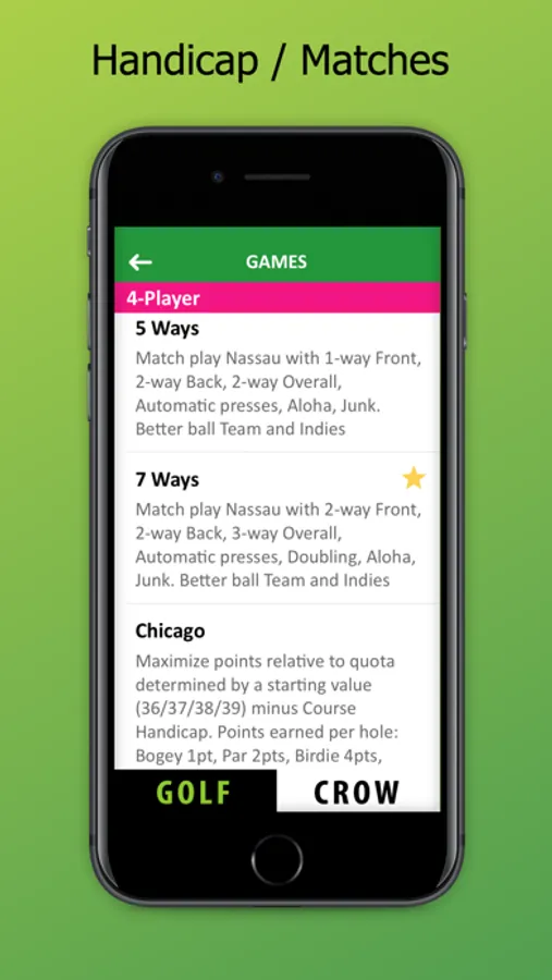 This is a golf app players actually use out on the course. It's been battle tested over multiple seasons and settled many hundred thousands in wagers (players handle settlement, we do not presently move funds). The idea for Golf Crow arose out of the popular 7 Ways and Nassau games played at golf clubs in the New York Metro area. More information is available on our website www.golfcrow.com