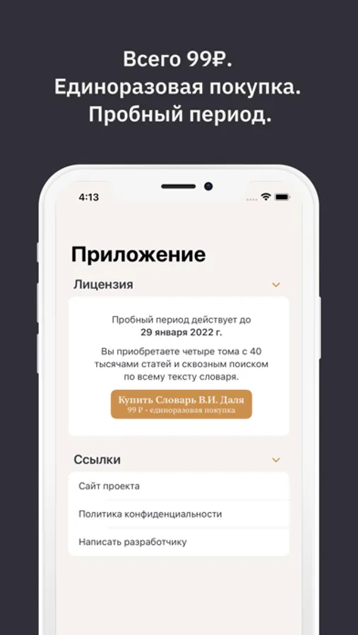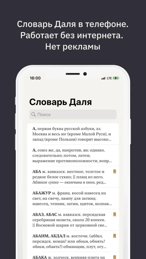 Словарь Даля со сквозным поиском по полному тексту 40 тысяч статей. Работает без интернета. Нет рекламы. Четыре тома классического издания словаря (а это две тысячи страниц) теперь помещаются у вас в кармане. Статьи свёрстаны для удобного чтения на экране iPhone.
