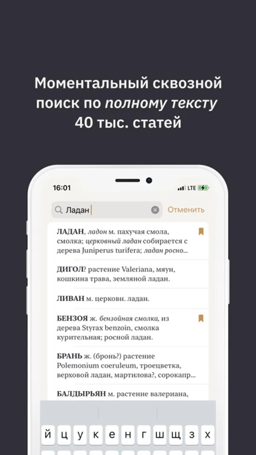 • Офлайн-словарь с моментальным умным поиском по тексту всех статей, (а не только по заголовкам.) Такая система особенно актуальна для словарей гнездового типа, где в одной статье-гнезде может обитать множество однокоренных слов. Специально для приложения я реализовал особый алгоритм ранжирования результатов поиска, позволяющий быстрее находить интересующие исследователя слова.