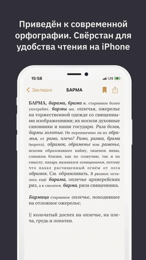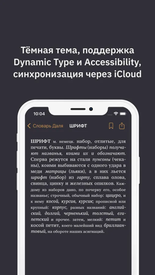 • Поддержка Dark Mode (темночтения?), Dynamic Type (крупнобуквия?) и прочих функций для настройки типографики. У людей, много работающих с текстами, всегда есть предпочтения по размерам шрифтов и элементов интерфейса. Некоторым любителям работать ночью больше нравится читать белый текст на тёмном фоне — так меньше устают глаза. Эта версия словаря Даля поддерживает все эти системные настройки.