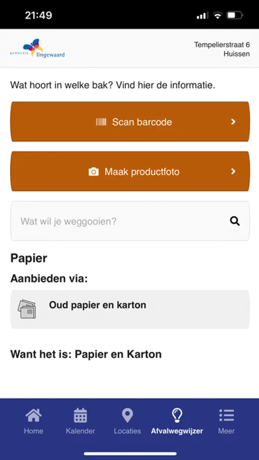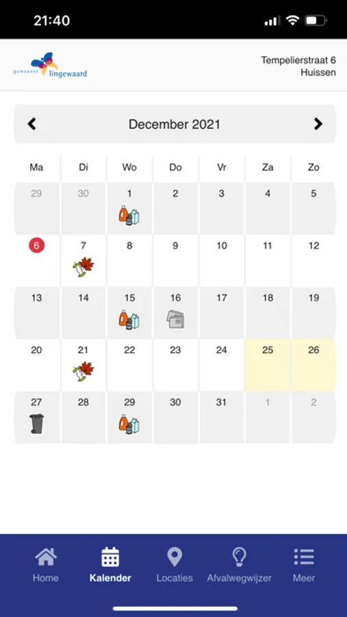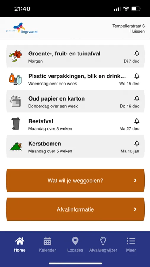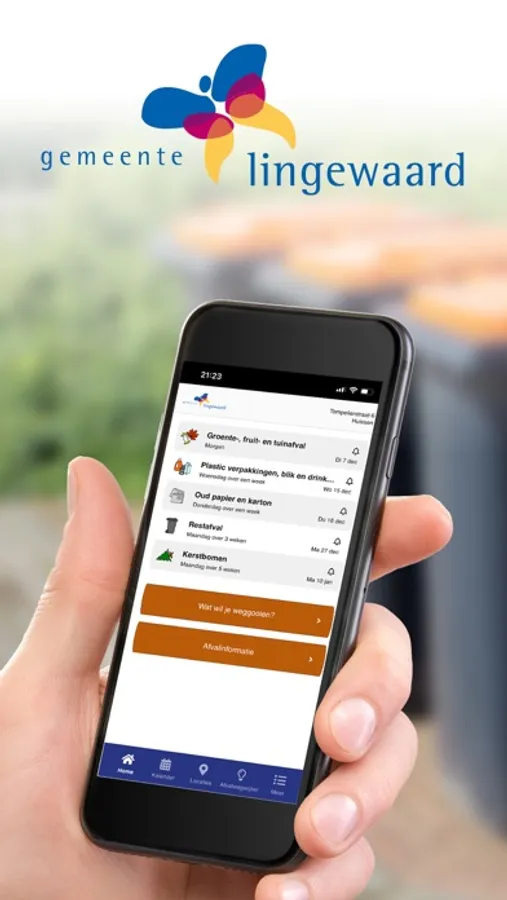 Woont u in de gemeente Lingewaard? Voer dan uw postcode en huisnummer in. Vervolgens ziet u in de digitale afvalkalender alle informatie over het scheiden van het huishoudelijk afval en het aanbieden van huishoudelijk afval. U kunt tevens een push-bericht ontvangen wanneer het afval aan de straat gezet kan worden.