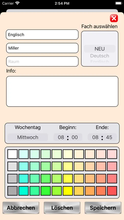 Füge problemlos Termine in den Woochenplan ein. Der Stundenplan zeigt immer die aktuelle Wochen und die nächsten 2 Wochen an.