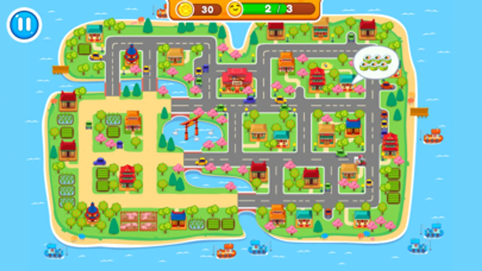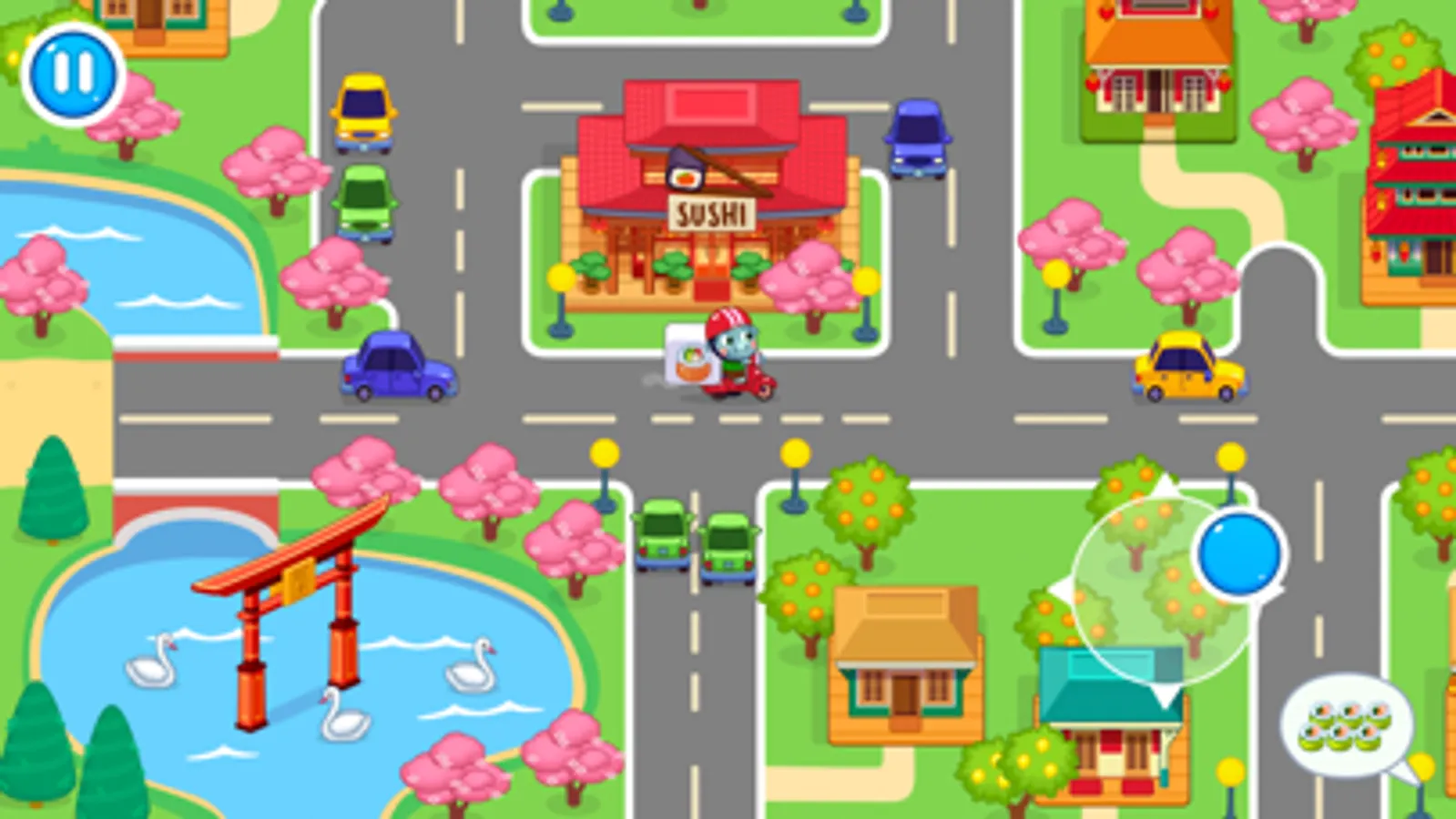 Well, let's get started! Today you our restaurant is full of visitors. Quickly accompany them to banquet hall, suggest them to take seats and start gathering orders. Then hurry up to the kitchen and start cooking. You don't know how to make rolls? It's very easy! Just place a sheet of nori and cover it with a thin layer of rice. Then add shrimps, fish and other ingredients in a line on top of the rice in the centre. Roll it all up and cut it in equal pieces. Put them carefully on a plate. Add some wasabi and ginger. That's it! Meal is ready! Now you can serve it. And don't forget about bracing beverage. Offer to your guests tasty and aromatic tea. Full and satisfied clients will reward you with coins. Further you can use them to upgrade your place. Also some one can order delivery. So don't forget to deliver your sushi to houses in the streets of a small but beautiful town.