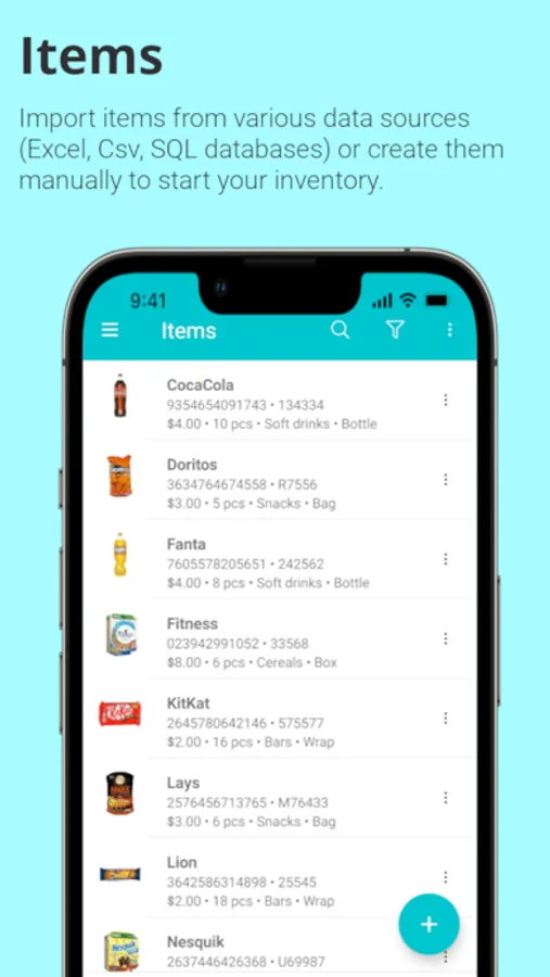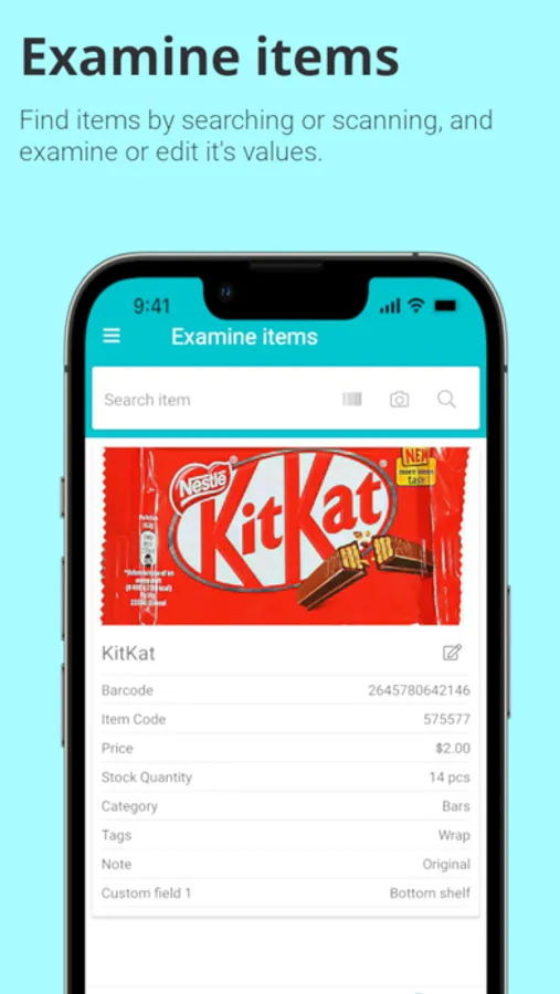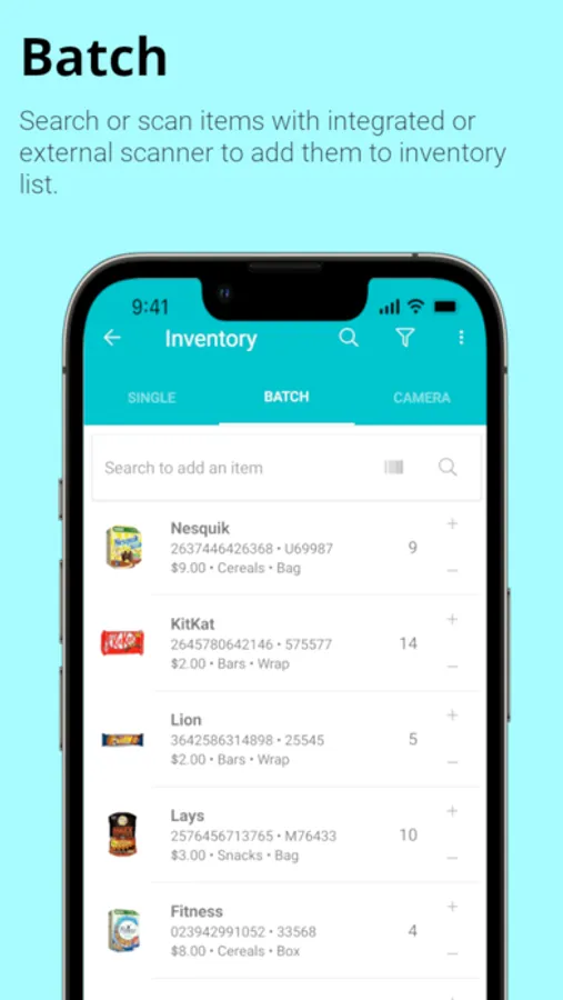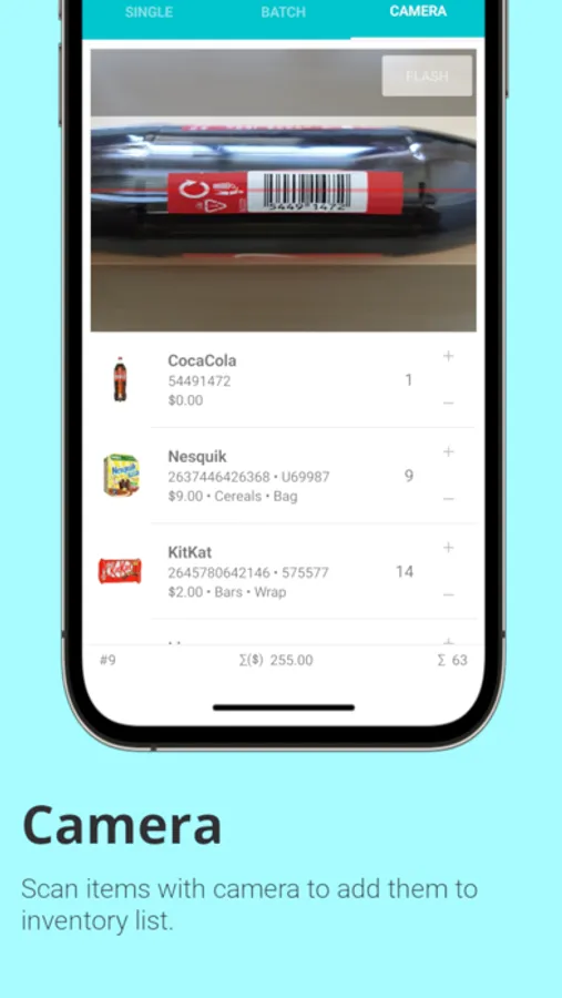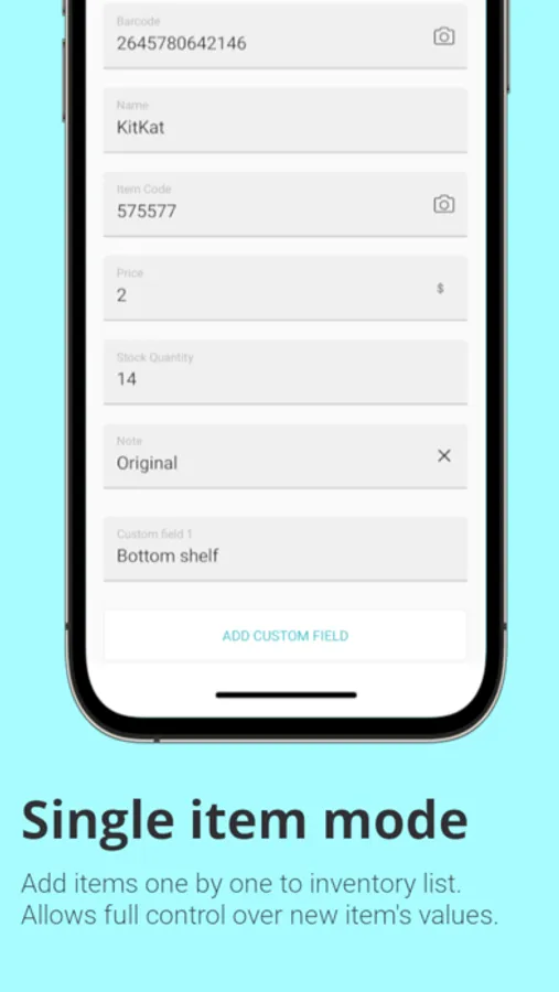 Application enables item barcode input via keyboard, Bluetooth barcode scanner, integrated scanner or integrated camera.