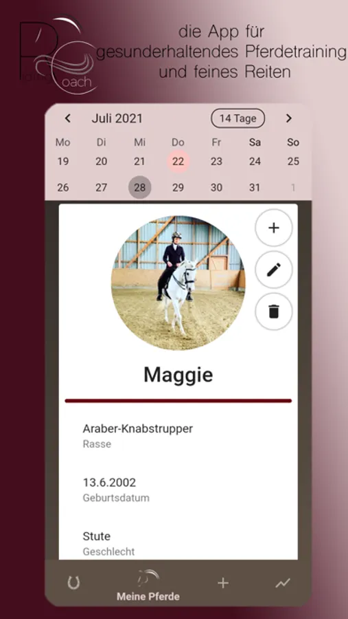 * Profile für mehreren Pferde, sodass du für jedes Pferd deine eigenen Trainingspläne und Statistiken erstellen kannst.