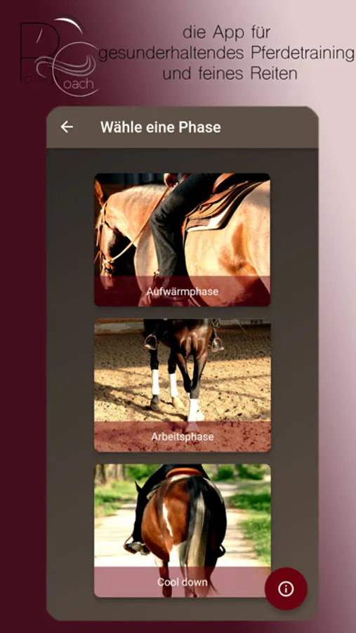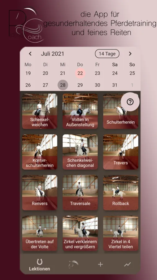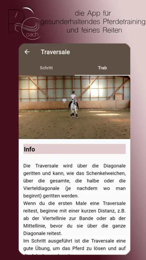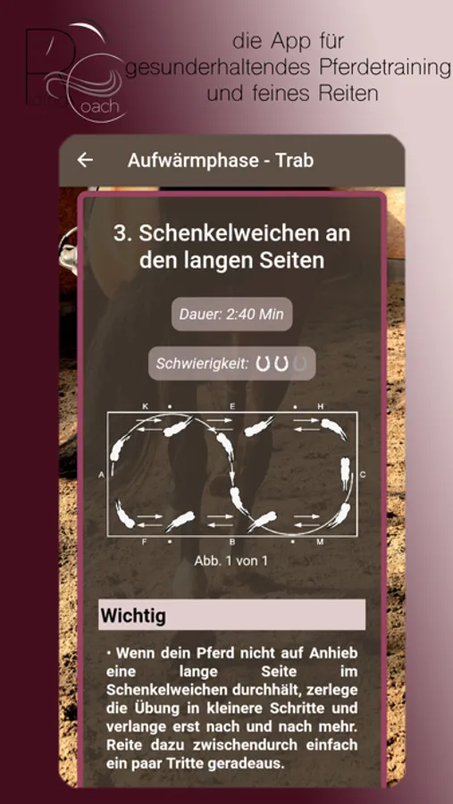 Suchbegriffe: Riding Coach, Ridingcoach, Reiten, Pferd, Pferde, Reitsport, Dressur, Dressurreiten, Pferdeausbildung, Bodenarbeit, Longieren, Ausreiten, Pferdetraining, Springreiten, Pferdeapp, Reitapp, Reitsportapp, Pferdesportapp, Pferdeapp, Trainingsplan Pferd, Pferdesport, Reiten mit feinen Hilfen, gesunderhaltendes Pferdetraining, gesunderhaltendes Reiten
