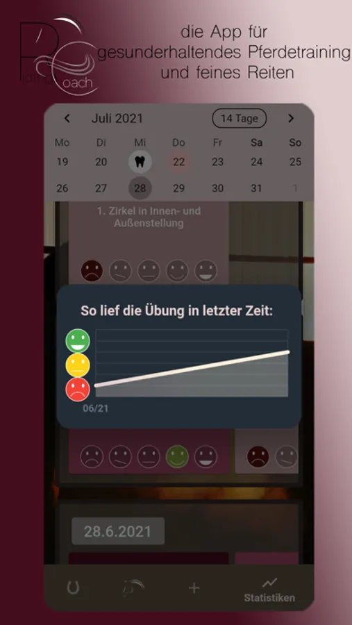 * Speicherfunktion für alle absolvierten Trainings im Kalender inklusive Bewertungsmöglichkeiten für eine übersichtliche Statistik, sodass du auch über einen längeren Zeitraum die Entwicklung deines Pferdes gut beobachten und dokumentieren kannst.