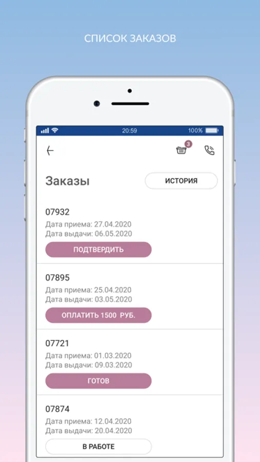 - посмотреть свои заказы в работе, их статусы, историю заказов;