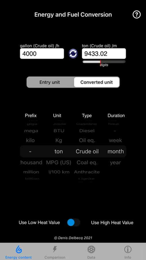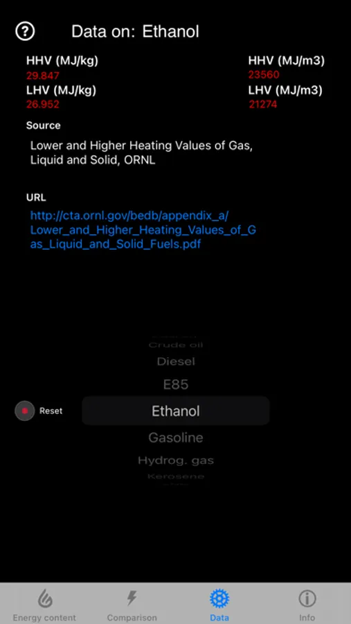 All energy content (in low and high heat value) are sourced, with instant access on the reference document on the internet. You can also use your own sources!