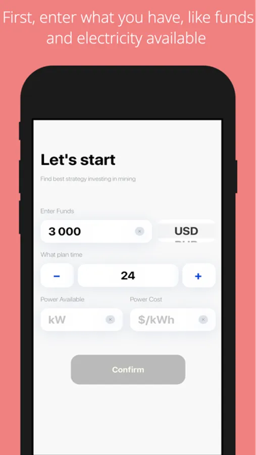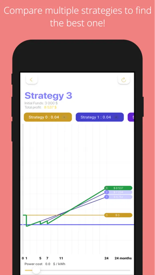 The App helps to plan an investment strategy in crypto-mining: build your own strategy and see how it will perform or take a suggested optimum strategy into consideration.