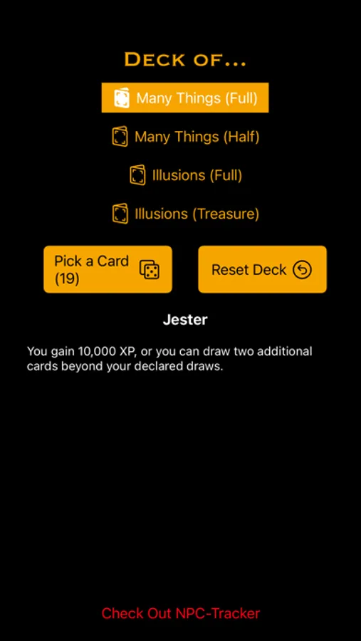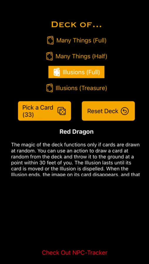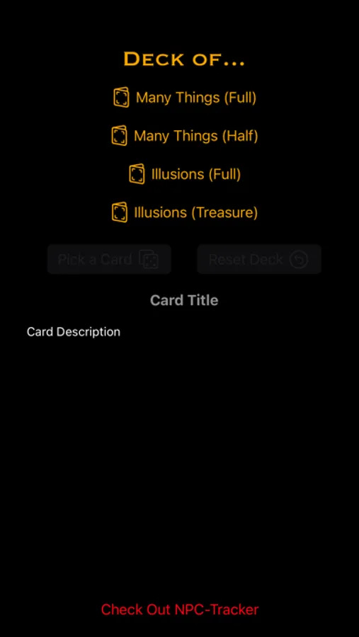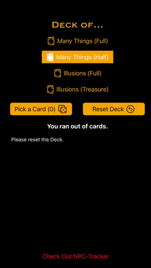 Keep track of how many cards are left in each deck, and draw a new randomized card in either delight or regret as you read through the description!