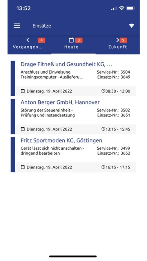 Im ERP geplante Einsätze werden dabei direkt den zuständigen Technikern in der App angezeigt, sodass eine gute Übersicht über frühere (noch nicht erledigte), heute anstehende und zukünftig anstehende Einsätze entsteht.