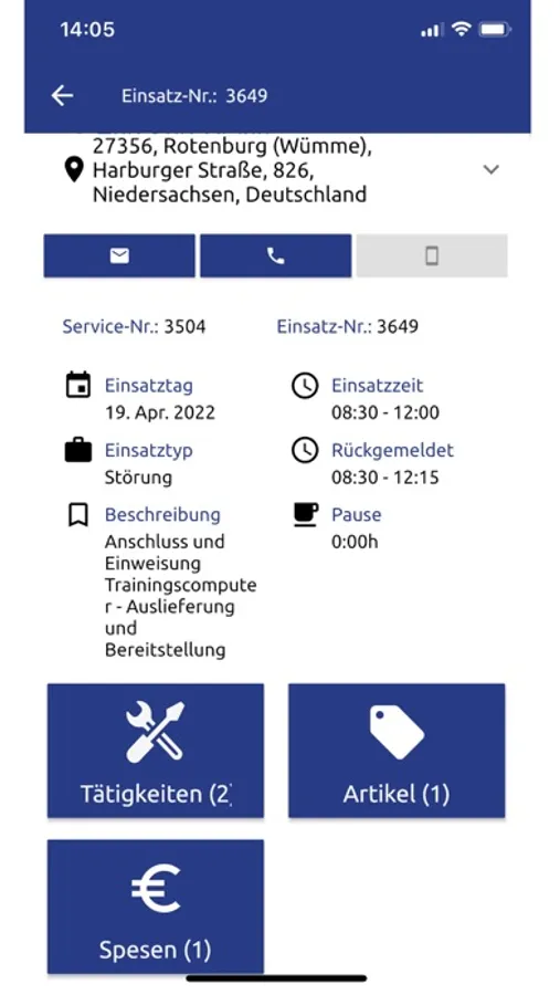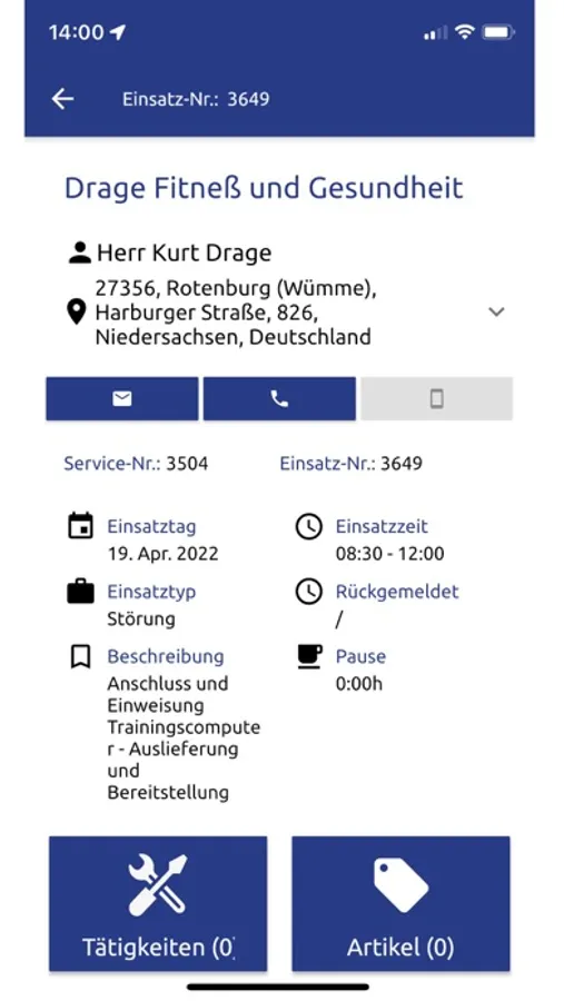 Innerhalb eines Einsatzes kann der Anwender dann auf Detailinformationen zum Einsatz, die Kontaktinformationen des entsprechenden Kunden sowie die Einsatzadresse zugreifen.