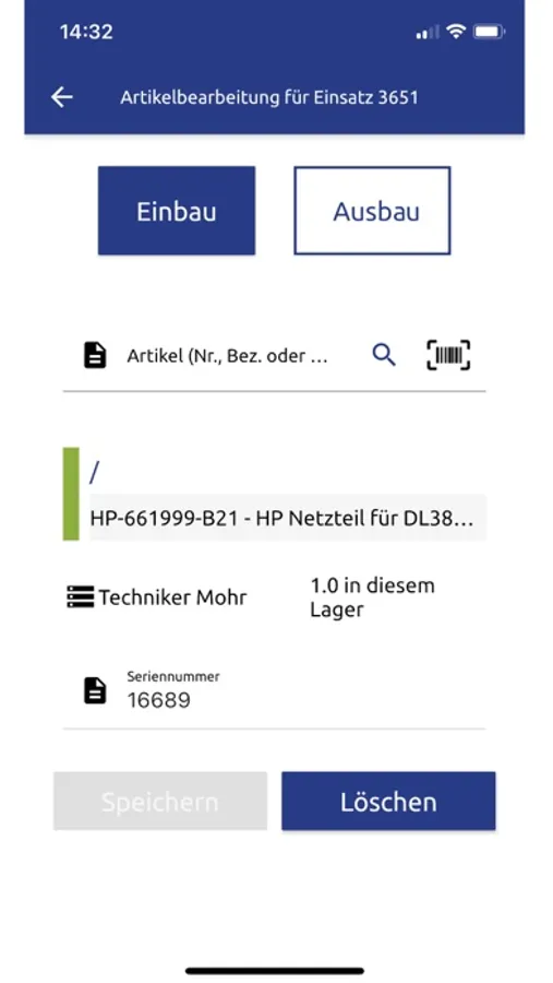 2. Buchung von Material mit Auswahl des Artikels, Angabe der Menge und optional der Seriennummer. Das Rückmelden vom verwendeten Material geht dank des Scanners schnell und einfach von der Hand.