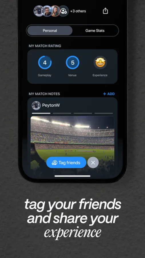 Momentos are dynamic—tag who you went to the game with, rate the experience in the venue, and add photos and notes from your perspective.