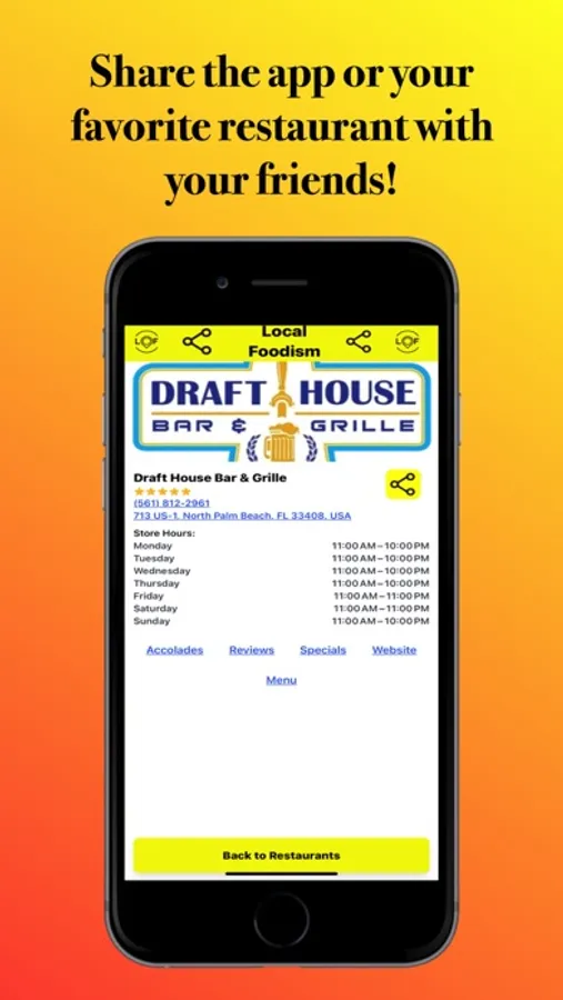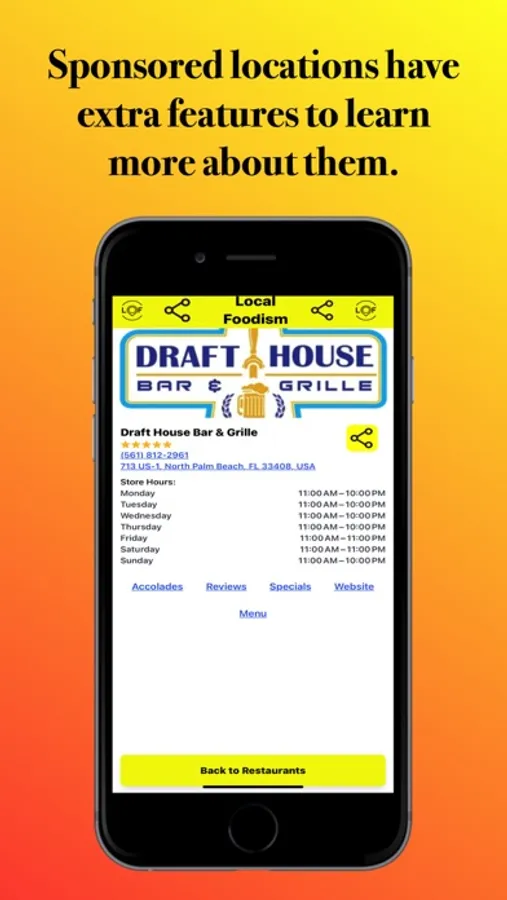 You’ll be able to check out the last 5 reviews, their hours of operation, and if they are sponsored locations, you’ll be able to view their specials, any accolades they want to brag about, a link to their menus (if published) and a link to their website (if published). Every restaurant has a story to tell and we’re here to help that story get told.