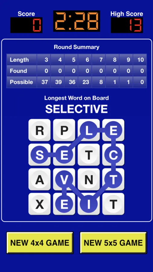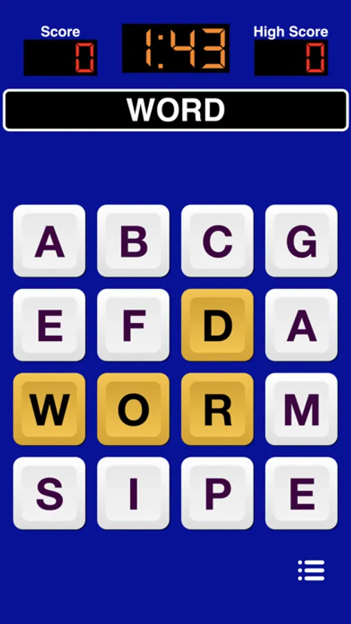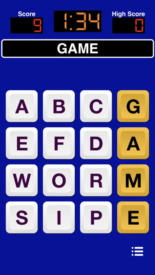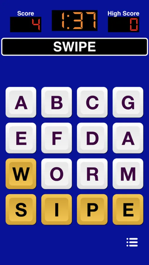 This game presents you with a grid of 4x4 or 5x5 of letters. Spell words by swiping the letters. Spell as many words as you can before time runs out.
