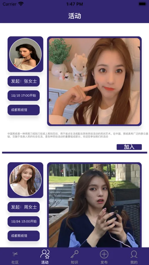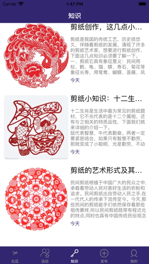 在这里您可以使用我们的应用发现超多和您一样喜欢剪纸的人。和他们分享交流剪纸技术,分享您的剪纸技艺。参加各类剪纸活动,认识更多喜欢剪纸的人。查看超多的剪纸知识,更好的了解剪纸。