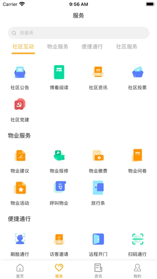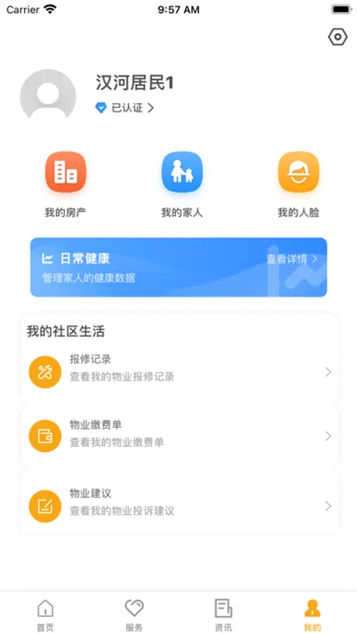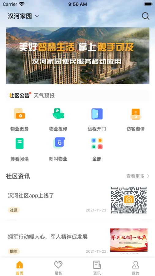 汉河家园APP为社区业主提供综合性社区服务,以提高社区安全保障和丰富社区生活品质。主要包括政务服务、社区互动、物业服务、便捷通行、社区服务五个方面的服务项目,如政务预约、社区公告、物业报修、物业缴费、呼叫物业、投诉建议、刷脸通行、拍照挪车、访客邀请、便民电话、家政服务等功能。