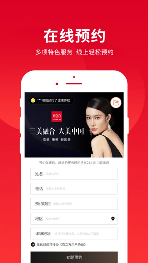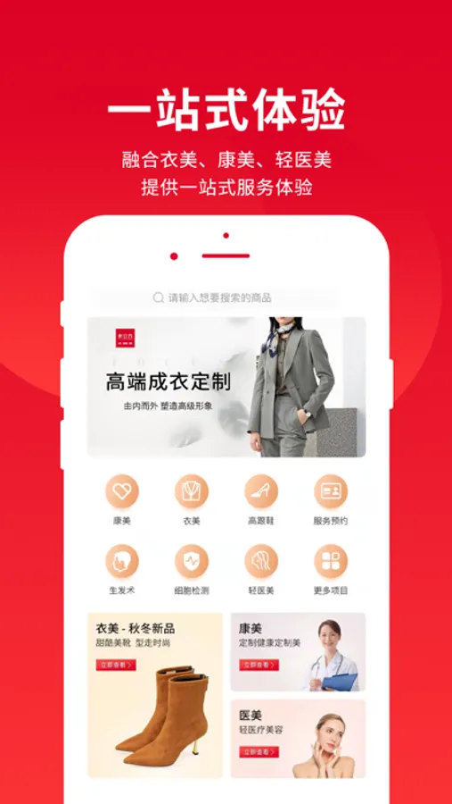 衣美:智慧男女衣橱,整体形象输出 轻医美:30分钟午休式逆龄 康美:查调养治防,定制您的健康 【在线预约】多项特色服务,线上轻松预约 【一站式体验】融合衣美、康美、轻医美,提供一站式服务体验 【专业保障】汇聚全国2000+专业顾问,为您的美丽健康保驾护航 【用户至上】以用户为中心,确保用户享受高质价比商品和服务