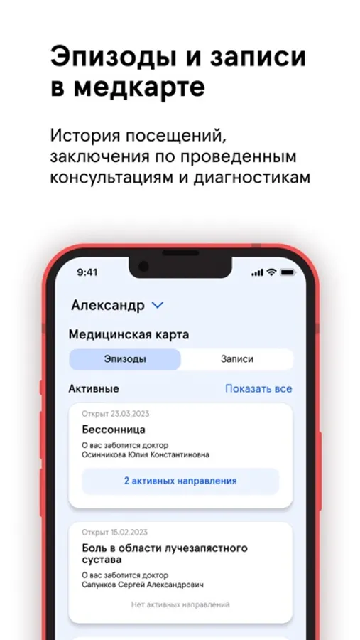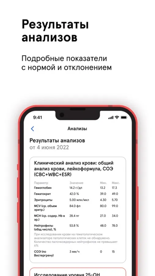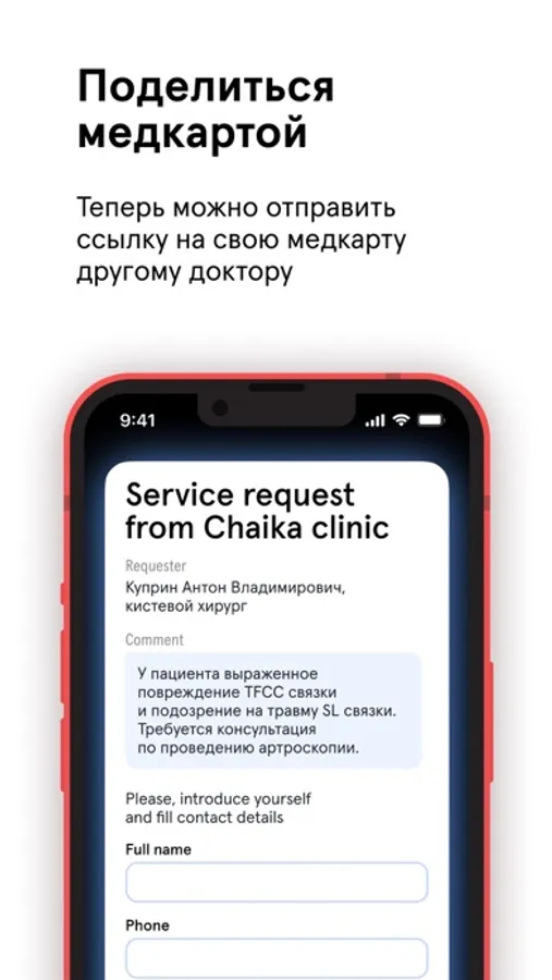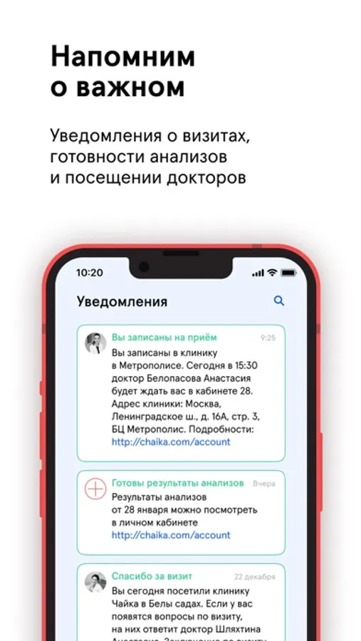 В нём всегда доступна ваша единая медицинская карта для этих клиник. В приложении будет храниться вся информация о вашем здоровье — результаты тестов, диагнозы, рецепты, снимки, направления и рекомендации врачей. А о предстоящем визите в клинику или готовности анализов вы получите уведомления.