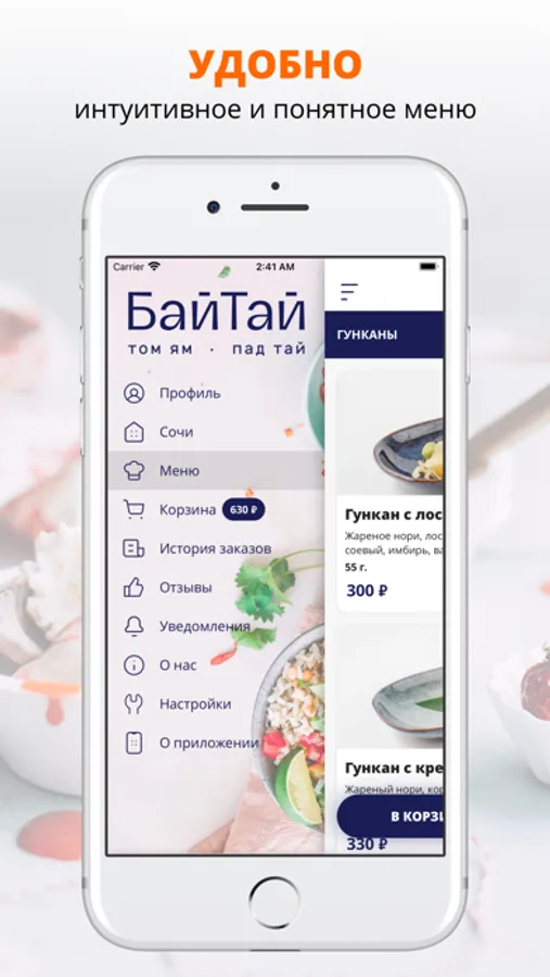 Приложение БайТай — это удобный способ заказа еды домой или в офис! Мы готовим наши блюда из качественных свежих ингредиентов и доставляем еду по Сочи быстро и бережно.