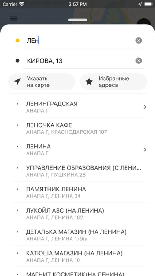 * Выбирать адрес на карте, вводить его вручную или выбирать из списка ранее использованных адресов