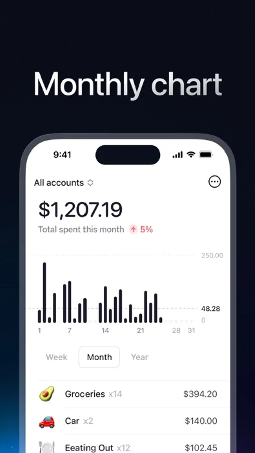 The insights screen is designed to be simple but pretty powerful: check your spending by weekly, monthly, and yearly periods. It helps understand when you spent more than expected and when follow your budget's rules.