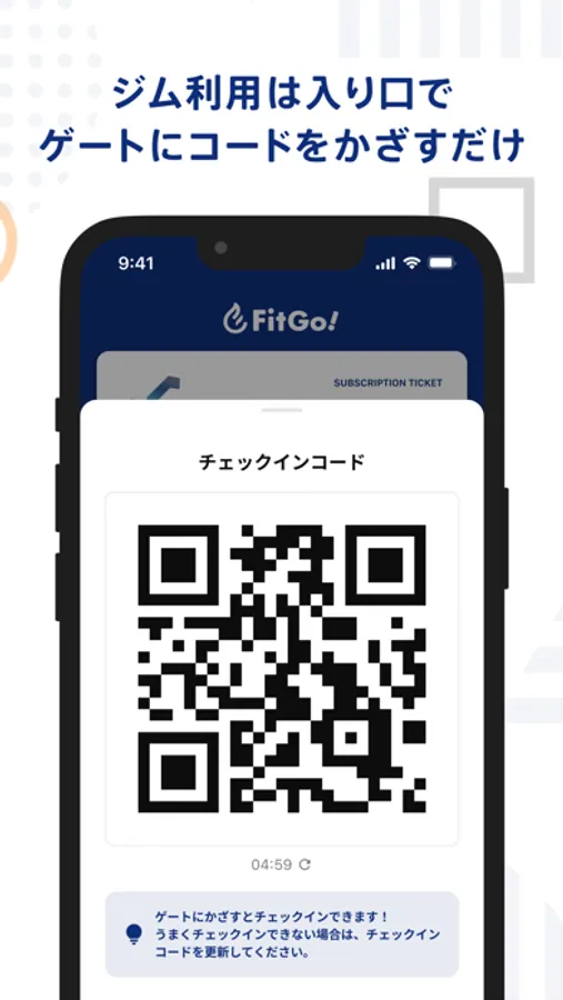 購入した「チケット」のコードをジムの入り口のゲートにかざすだけでチェックインできます。