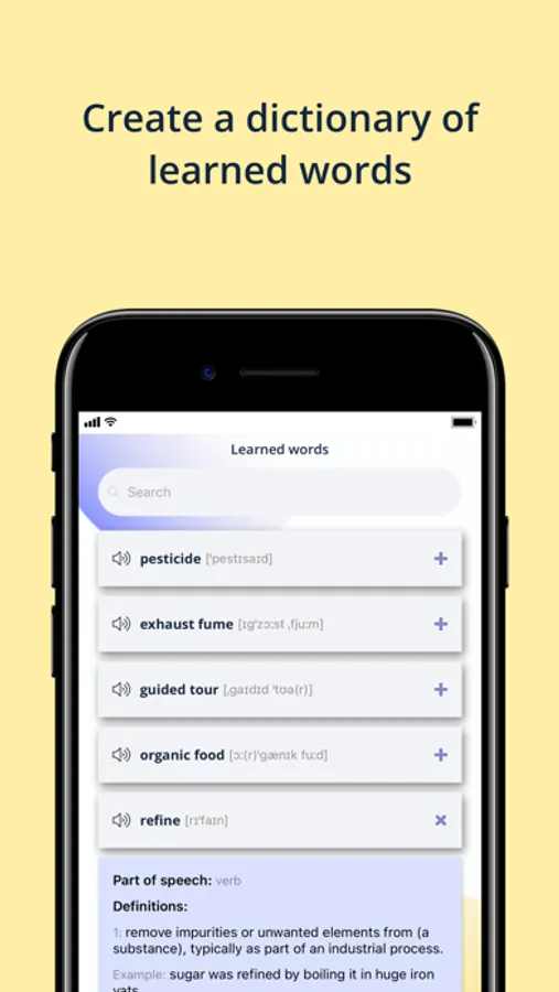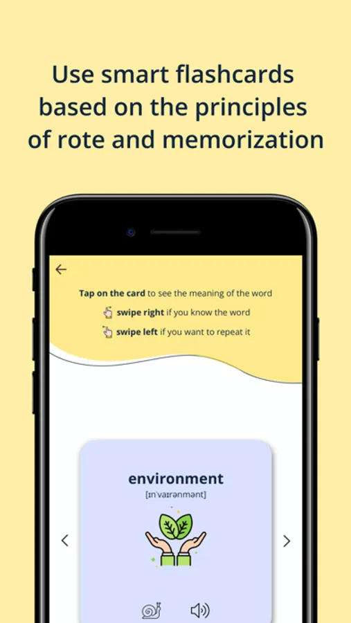 It takes many repetitions to remember new words. Our app allows you to learn new words with flashcards that are proved to be an efficient way to improve your vocabulary. Using flashcards is a very effective self-testing approach, and repetition helps you figure out what information you can remember easily and what needs additional effort.