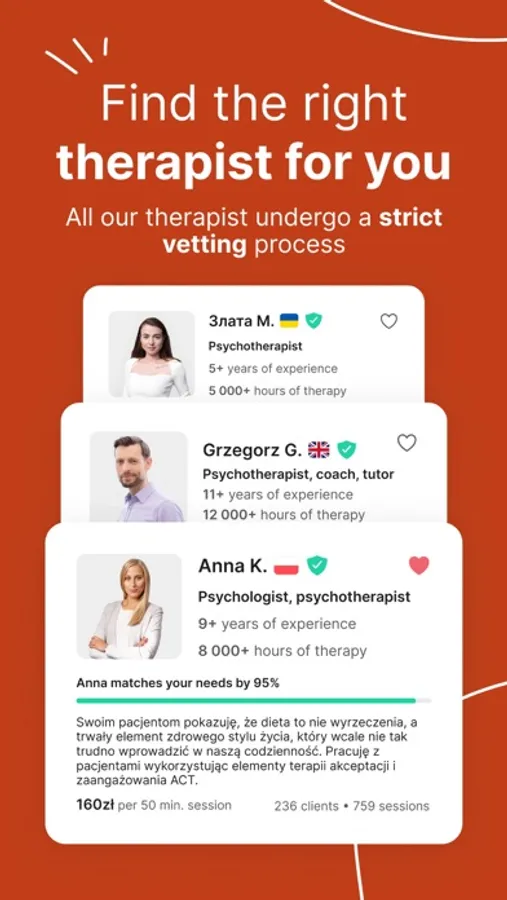 You can easily choose the language in which you’d like to do your therapy sessions, as well as the country of origin of your therapist to take into account various cultural nuances and specifics, which play an important role in effective therapy. Currently we cover English, Polish, Spanish, Italian, Ukrainian and Russian languages, and our therapists are from 20+ countries from around the world.