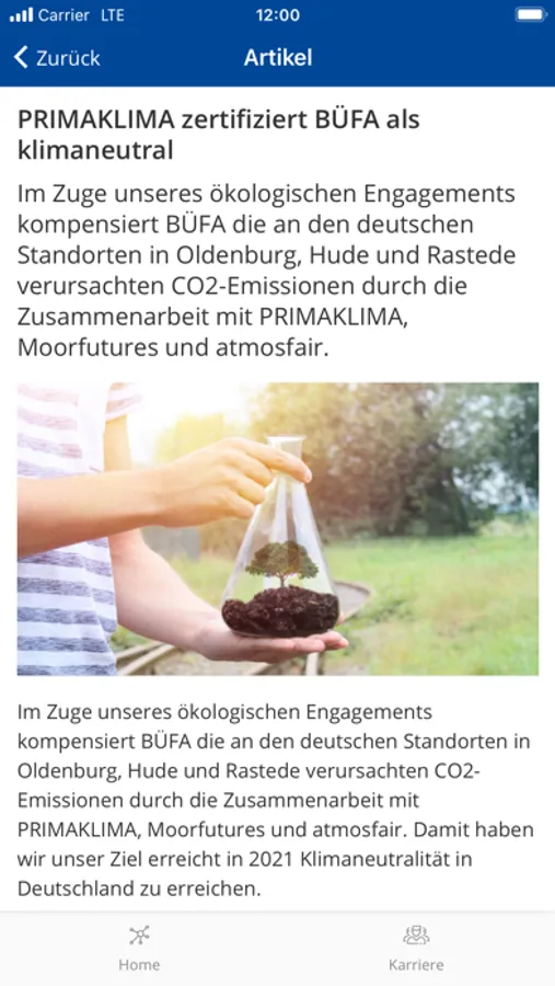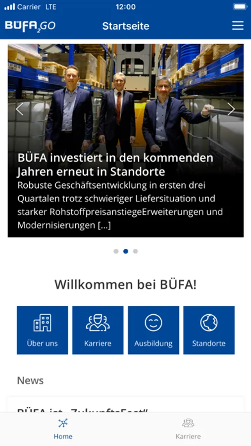 Mit BÜFA2go bietet die Unternehmensgruppe eine App an, die rund um die BÜFA-Welt informiert. Nutzer erhalten neben Informationen zu all unseren Standorten aktuelle Nachrichten aus den Geschäftsbereichen der BÜFA-Gruppe und verpassen dank Push-Nachrichten keine News. In unserer App können sich die Nutzer über interessante Stellenangebote als auch über die vielfältigen Ausbildungsmöglichkeiten informieren.