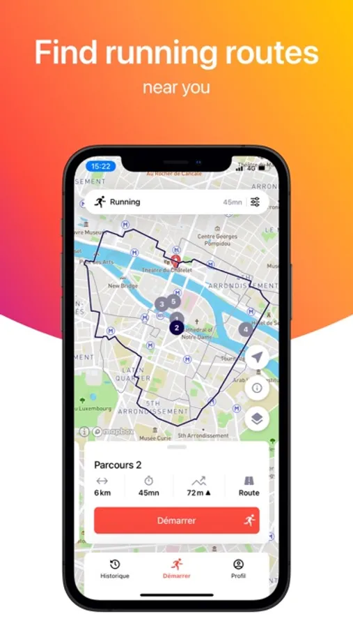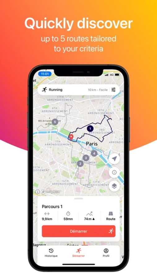 RunnrZ creates tailor-made routes next to your location based on your selected criteria, while guiding you through the practice with both a vocal and visual GPS ! Depending on your geolocation and requirements (duration or desired distance, type of terrain, level of practice, etc.), RunnrZ offers you up to 5 different routes to practice !