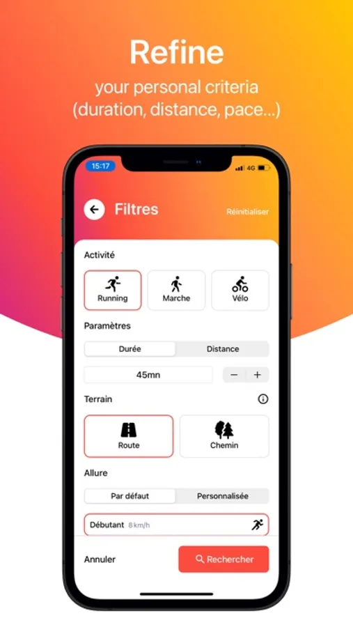 Specify the duration or distance you want to go for, indicate your level and view the proposed routes !