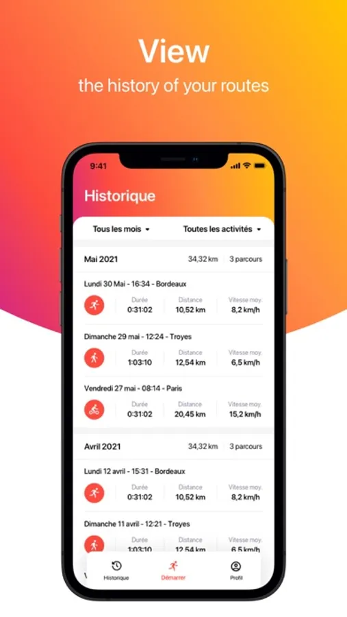 - Your activity history by type of practice (running, walking, cycling) and all routes taken