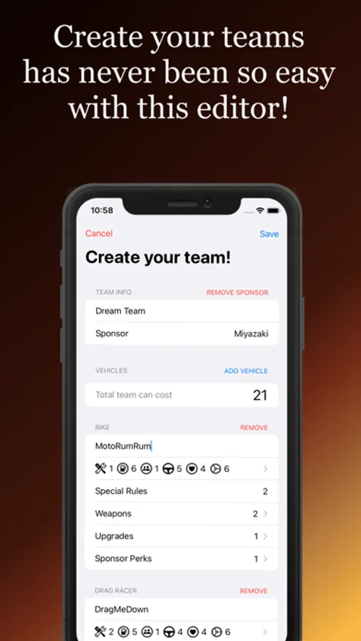 - The team editor will take care of all build slots, can costs and other limitations that could come from Sponsors, vehicle weight, facing, etc.